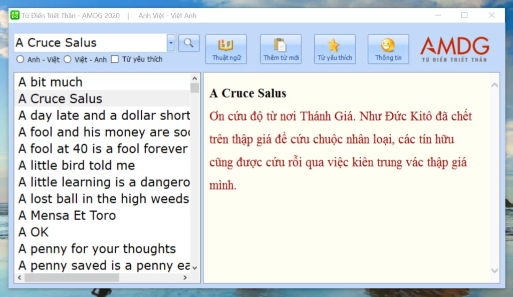 Để giúp cho việc đọc các tác phẩm triết học và thần học bằng tiếng Anh, và hỗ trợ cho các học viên đang theo học Triết Thần tại các Chủng viện và Học viện, chúng tôi xin giới thiệu tới quí vị ứng dụng Phần mềm và App Điện Thoại cho bộ Từ điển Triết Thần & Thuật ngữ Công Giáo, có tên AMDG Dictionary, bao gồm Anh – Việt và Việt – Anh.